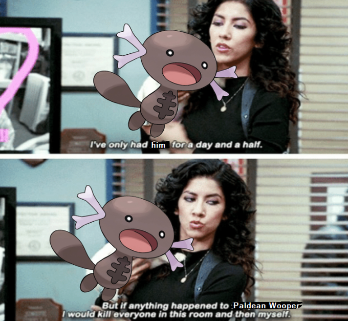 The same day, Twitter user @TheLyonTV[3] uploaded a Paldean Wooper version of the Brooklyn Nine-Nine meme I've Only Had Arlo For A Day And A Half with the Paldean Wooper being the thing held by Rosa, showing the intense love the Fanbase has for the new version of Wooper (shown below).