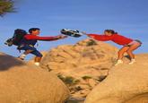 In the Spring 1995 Patagonia outdoor wear catalog, the company featured. a photograph by Greg Epperson featuring a man and woman tossing a bag across a chasm (shown below, left).[1]