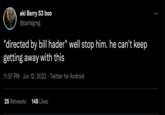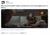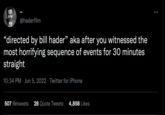 In 2018, Hader co-created Barry, his HBO comedy about a contract killer aspiring to be an actor, which became a critically acclaimed series that won him two Emmys for his acting and several nominations for his writing and directing. The third season of the show earned particular praise online in mid-2022, especially for the darker and more dramatic turns that the plot and style took under Hader's direction.[3] For example, a tweet posted by the fan account @haderfilm on the day of Barry's third season finale praised Hader's work and earned 18,600 likes over the course of the next few days (seen below).
