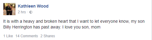 [10] Facebook – It is with a heavy and broken heart that I want to let everyone know, my son Billy Herrington has past away.