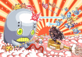 In 2006, Robertson animated the short film "Pirate Baby's Cabana Battle Street Fight,"[6] which featured pixel art resembling a 2D side-scroller fighting game with characters using various weapons to battle an onslaught of enemies (shown below, left). In 2008, Robertson released the film "Kings of Power 4 Billion %,"[7] which featured similar fighting game graphics and enemy battles (shown below, right).