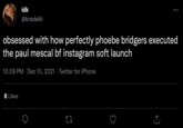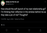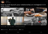 The practice is strongly associated with Instagram, but since relationship soft launches tend to not label themselves as such, it is unknown when exactly the first relationship launch may have happened on the platform. The phrase continued to be used sporadically on Twitter throughout the latter half of the 2010s without generating a large amount of engagement up until July 12th, 2020, when comedian Rachel Sennott tweeted about the practice, receiving nearly 130,000 likes in two years.[3]