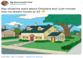 Say Whatcha Want About OnlyFans is an image macro series parodying a tweet made by OnlyFans user Sarvani in April 2020. The entire post features a photograph of the model's house that she purchased using money made on the OnlyFans social media service and reads, "Say whatcha want about Onlyfans but I just moved into my dream house at 22." On Twitter, the caption is often paired with other photographs of absurd homes and locations.