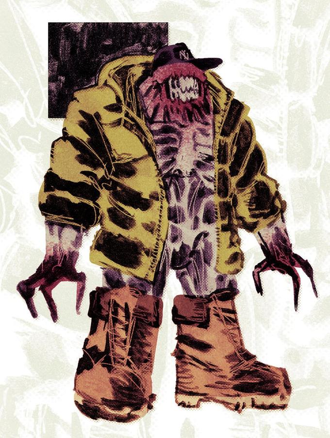 Timbler is a version of Shambler wearing Timberland boots, an oversized yellow puffer jacket and a New York Yankees hat. The word is a portmanteau of "Timbs" (Timberlands) and "Shambler."