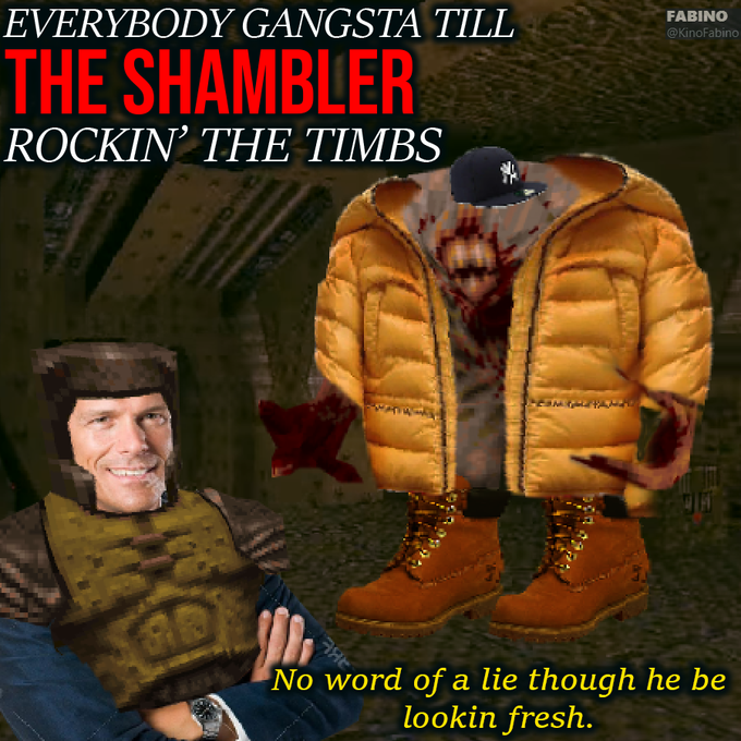 Shambler is a yeti-like enemy from the 1996 first-person shooter video game Quake. In the late 2010s, the character achieved widespread use in a number of niche memes within the classic FPS community, namely Timbler and Mama Shambler.