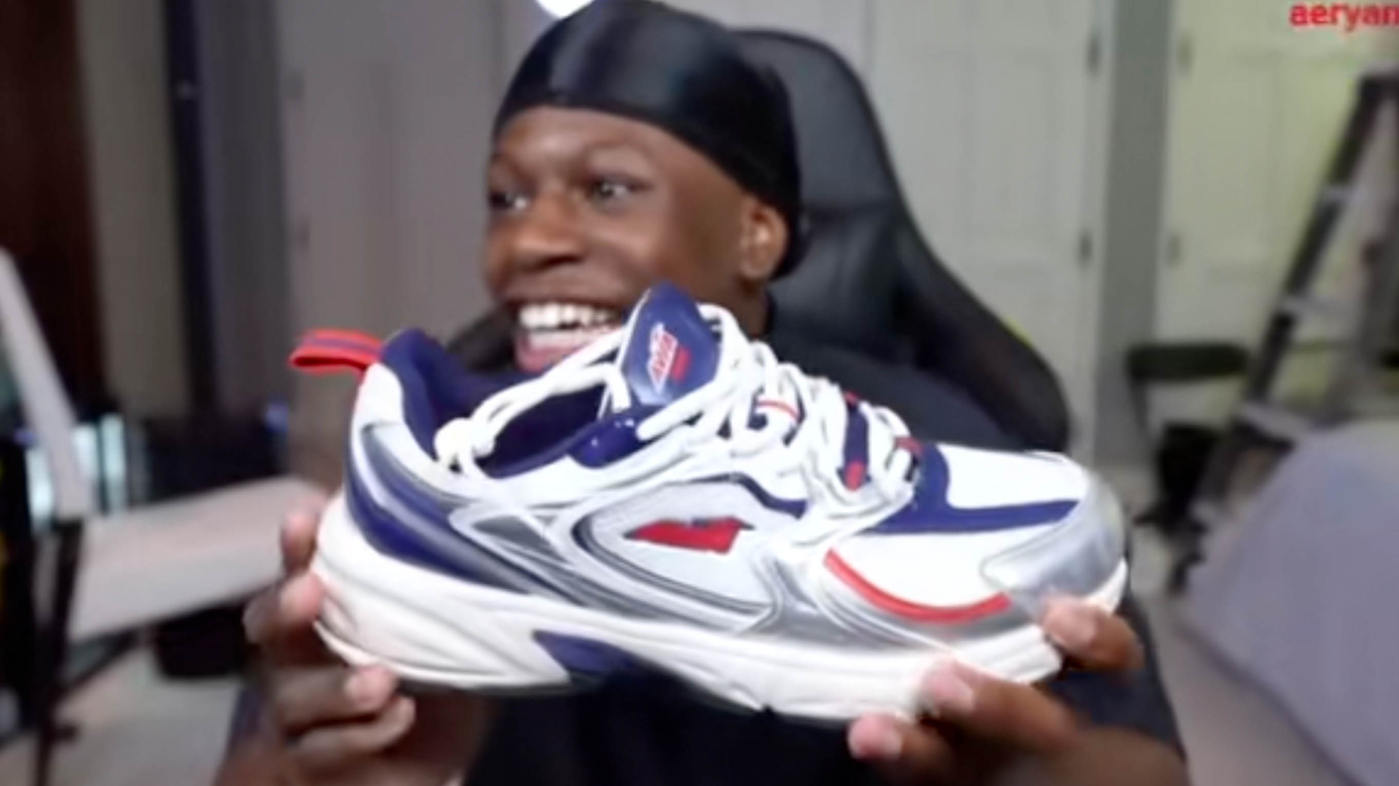 At the 17:39-minute mark of the Kai Cenat Live video (shown below), Cenat picks out a pair of Avia sneakers for Rakai that are white with blue, orange and grey accents.