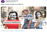 "Take It Easy, Dude, But Take It" is a memorable quote uttered by American ethnobotanist, author and psychedelics advocate Terence McKenna. The phrase, taken from a documentary on McKenna, has inspired a series of image macros and GIFs.