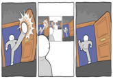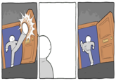 The Deathbulge Party Saga is a webcomic by the British artist Dan Martin (a.k.a. Deathbulge), which features various people showing up to a party and kicking open the door over the course of 12 hours. Online, edited versions of the comic often feature a row in which a man opens the door, discovers something disturbing and promptly exists the room.