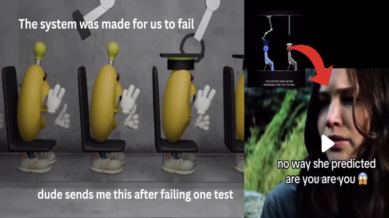 On December 25th, 2025, TikTok[1] user @dropship posted a video of figures moving along a conveyor belt, being rewarded with degrees after being brainwashed and having their curiosity destroyed, which is represented by the lightbulbs above their heads being smashed.