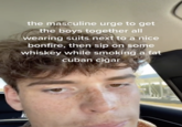 The Masculine Urge refers to a concept and catchphrase used in memes to describe common stereotypically male urges, traits and tendencies in a comedic light. The concept is often used in ironic memes that make light of and criticize the mental and physical health struggles of men and the idea that men hide their true emotions, such as "the masculine urge to do anything but go to therapy." The phrase, used as a phrasal template by swapping out the last word, became popularized in late 2021 starting around August alongside memes about The Feminine Urge.