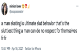 The first known post to suggest a humorous "sluttiest thing a man can do" was posted on April 19th, 2021, by Twitter user @asapasseater,[1] who tweeted "a man skating is ultimate slut behavior that’s the sluttiest thing a man can do no respect for themselves fr fr." The tweet only gained 14 likes over one year (shown below).
