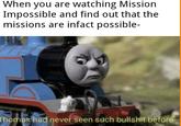 Thomas Had Never Seen Such Bullshit Before is reaction image macro of the character Thomas the Tank Engine with the phrase added by users for humorous effect.