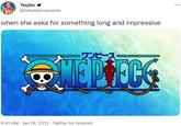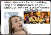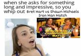 On January 19th, 2021, Twitter[3] user @baby5donquixote posted a tweet, "when she asks for something long and impressive," and an image of the One Piece logo, gaining over 4,300 likes in a year. On September 18th, Twitter[4] user @90swwe posted a version of the Griffith meme about a Bret Hart vs. Shawn Michaels match, gaining over 5,200 likes and 600 retweets in 10 months (shown below).
