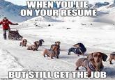 When You Lie On Your Resume But Still Get The Job is a phrase used in image macros and on videos to describe content showing someone or something, often an animal, comically out of place in a given setting, as if they lied on their work resume to get there and it's obvious. The first viral meme to use the phrase was uploaded to Reddit in 2016 and became increasingly popular over the following years.