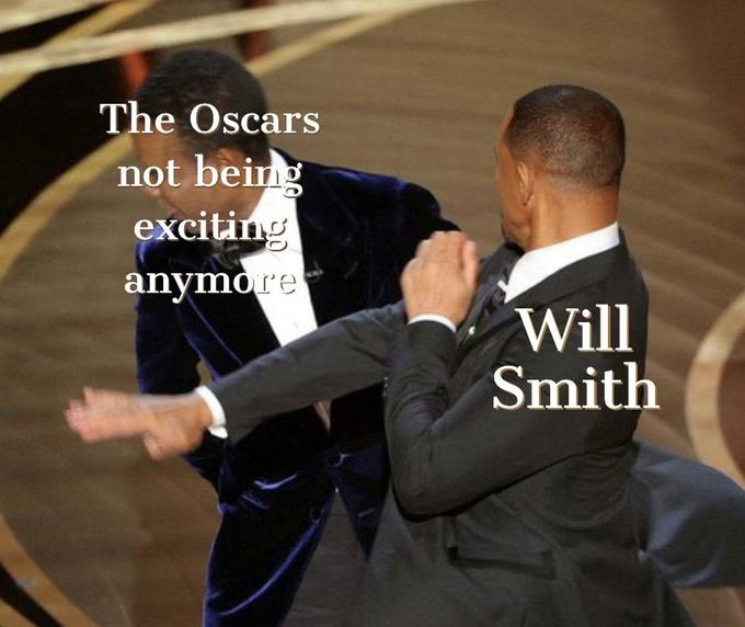 During the 94th Academy Awards ceremony on March 27th, 2022, comedian Chris Rock was presenting the award for best documentary feature, which eventually went to Summer of Soul. While on stage, Rock made a joke about Jada Pinkett Smith, Will Smith's wife (also known from the Entanglement meme), and how because of her shaved haircut, she could have starred in G.I.Jane. This prompted a mixed reaction from the crowd with Will initially appearing to laugh but Jada visibly upset next to him (shown below).