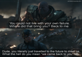 "You Couldn't Live with Your Own Failure, Where Did that Bring You? Back to Me" is a quote said by Thanos in the Marvel film Avengers: Endgame. It has been used as a reaction image for when people return to a previous state or circle after failing in another, and the text itself is also used online as a standalone catchphrase to reply to people in threads and conversations where they are returning back to something they previously discarded or quit.