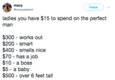 A typical "You have $5 to build the perfect man" post will set a budget to create an idealized partner, and then assign desirable traits a certain amount of money (example shown below).