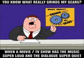 "You Know What Really Grinds My Gears" is a memorable quote from the 2005 animated comedy film Family Guy Presents: Stewie Griffin: The Untold Story.[1] On the web, the expression is used to preface an airing of grievances in an advice animal image macro series featuring Family Guy protagonist Peter Griffin.