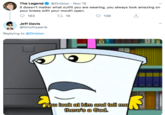 "You Look At Him And Tell Me There's A God" is a line of dialogue spoken by Master Shake about Meatwad from the animated TV series Aqua Teen Hunger Force in response to Frylock saying he wants them to join a church. A subtitled screenshot from the scene became popular as a reaction image and in image macros starting in 2017.
