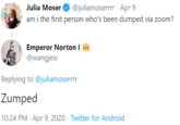 On April 9th, 2020, freelance writer for BuzzFeed and Twitter user @juliamoserrrr tweeted, "am i the first person who's been dumped via zoom?" which received over 62,800 likes and 1,800 retweets in five days. Twitter user @wangjexi[3] replied with the word "Zumped" which gained over 360 likes in five days (shown below).