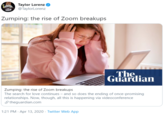 On April 13th, 2020, Twitter user @TaylorLorenz[4] shared both a BuzzFeed[2] and Guardian[1] Article about "zumping" (shown below, left). The tweet garnered over 320 likes in a day. That same day, Twitter user @not_about_love_ [5] shared a Gossip Girl Title Remix meme with the caption, "why don’t i have a bf who will zump me on zoom" (shown below, right).