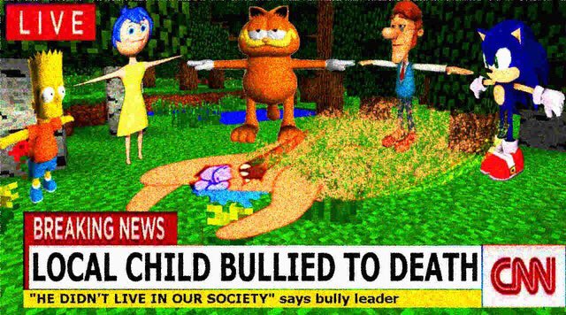 we live in a society deep fried headline minecraft the simpsons bart simpson inside out joy garfield the adventures of jimmy neutron boy genius hugh neutron sonic the hedgehog bully bullying t-pose spongebob squarepants patrick star cnn