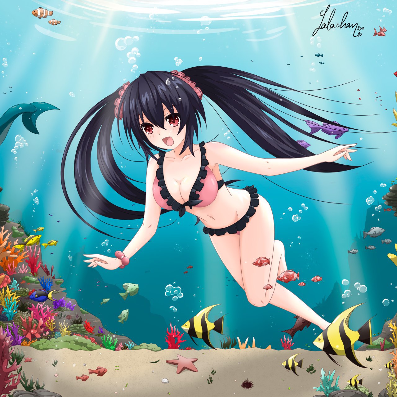 hyperdimension neptunia neptunia noire nowaru nowa idea factory compile heart lalachan black hair red eyes twintails swimsuit breasts medium breasts goddess underwater swimming diving