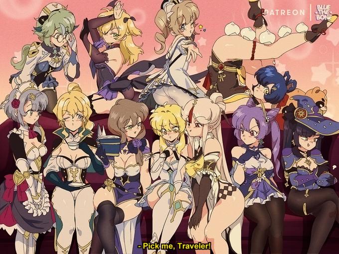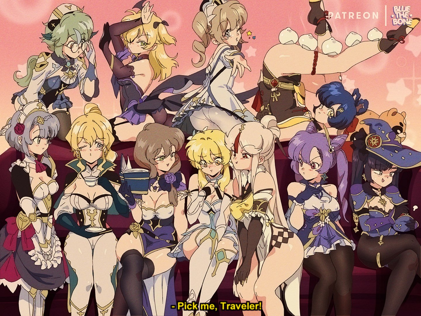 genshin impact traveller lumine mona keqing xiangling guoba sucrose fischl jean gunnhildr noelle barbara ningguang 90s anime retro anime