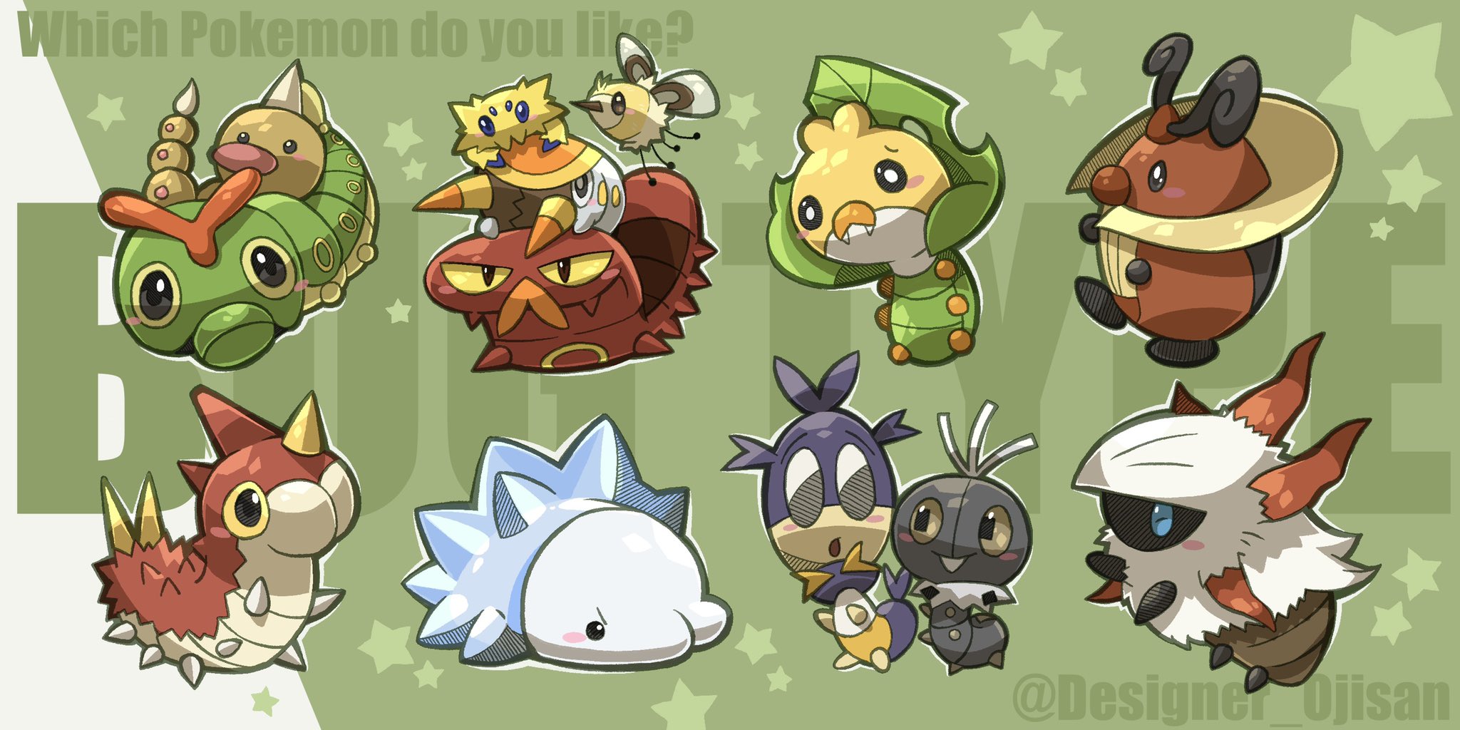 pokémon caterpie weedle joltik cutiefly grubbin sizzlipede sewaddle kricketot wurmple snom blipbug scatterbug larvesta designer_ojisan