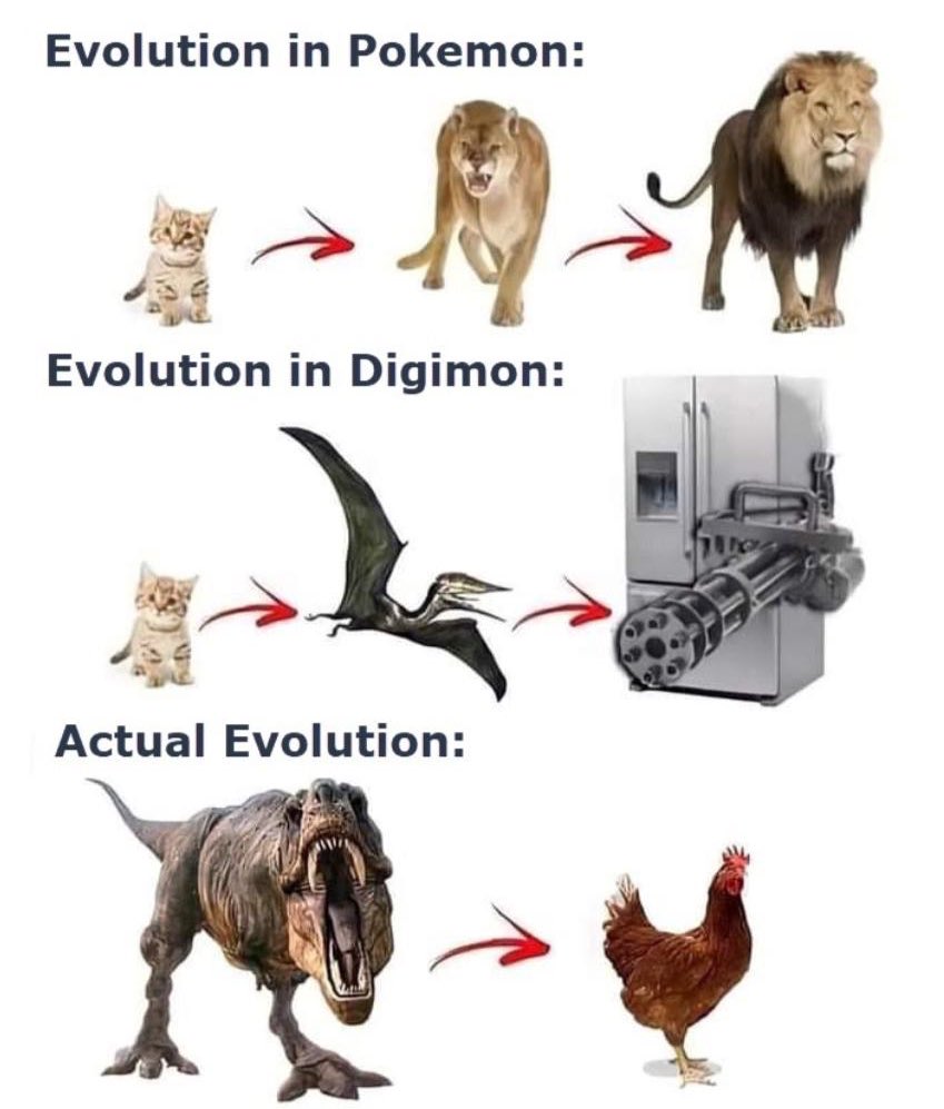 evolution pokemon digimon reality darwin tyranosaurus rex t-rex bird kitten cat pterodactyl fridge machine gun lion cougar chicken