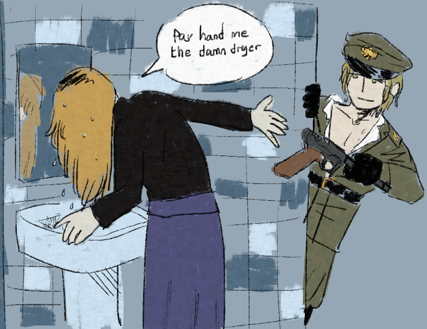 hand me the damn dryer darling please give me the hair dryer boomer humor boomer comics wife bad handgun revolver fear and hunger