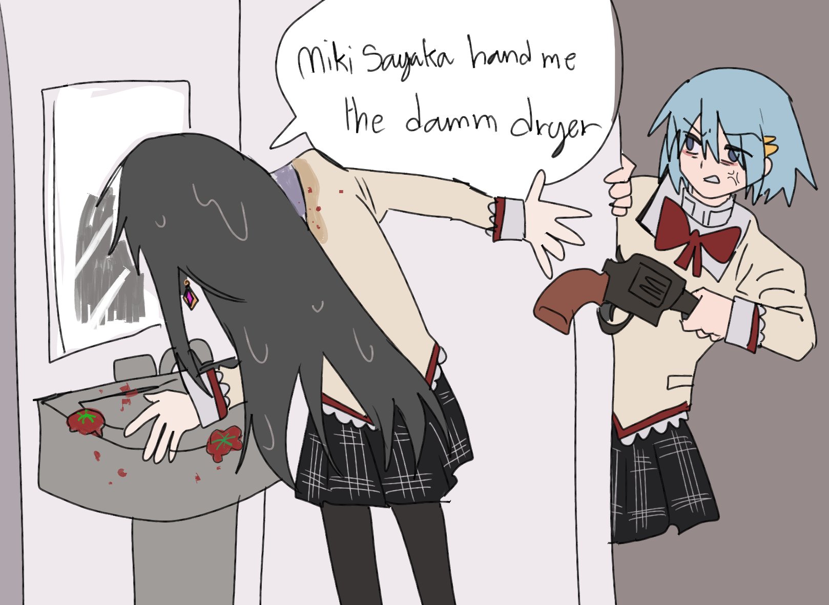hand me the damn dryer darling please give me the hair dryer boomer humor boomer comics wife bad handgun revolver puella magi madoka magica