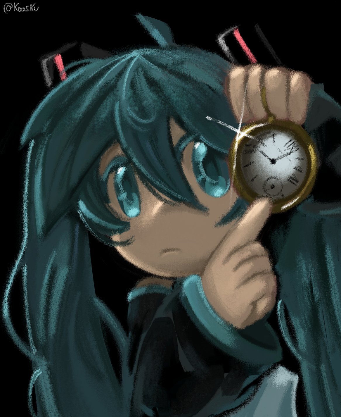 hatsune miku vocaloid white rabbit pointing at a clock koasku