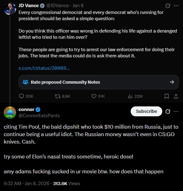 jd vance chao connoreatspants jd vance anger chao sonic 2026 ice shooting renee nicole good jonathan e ross
