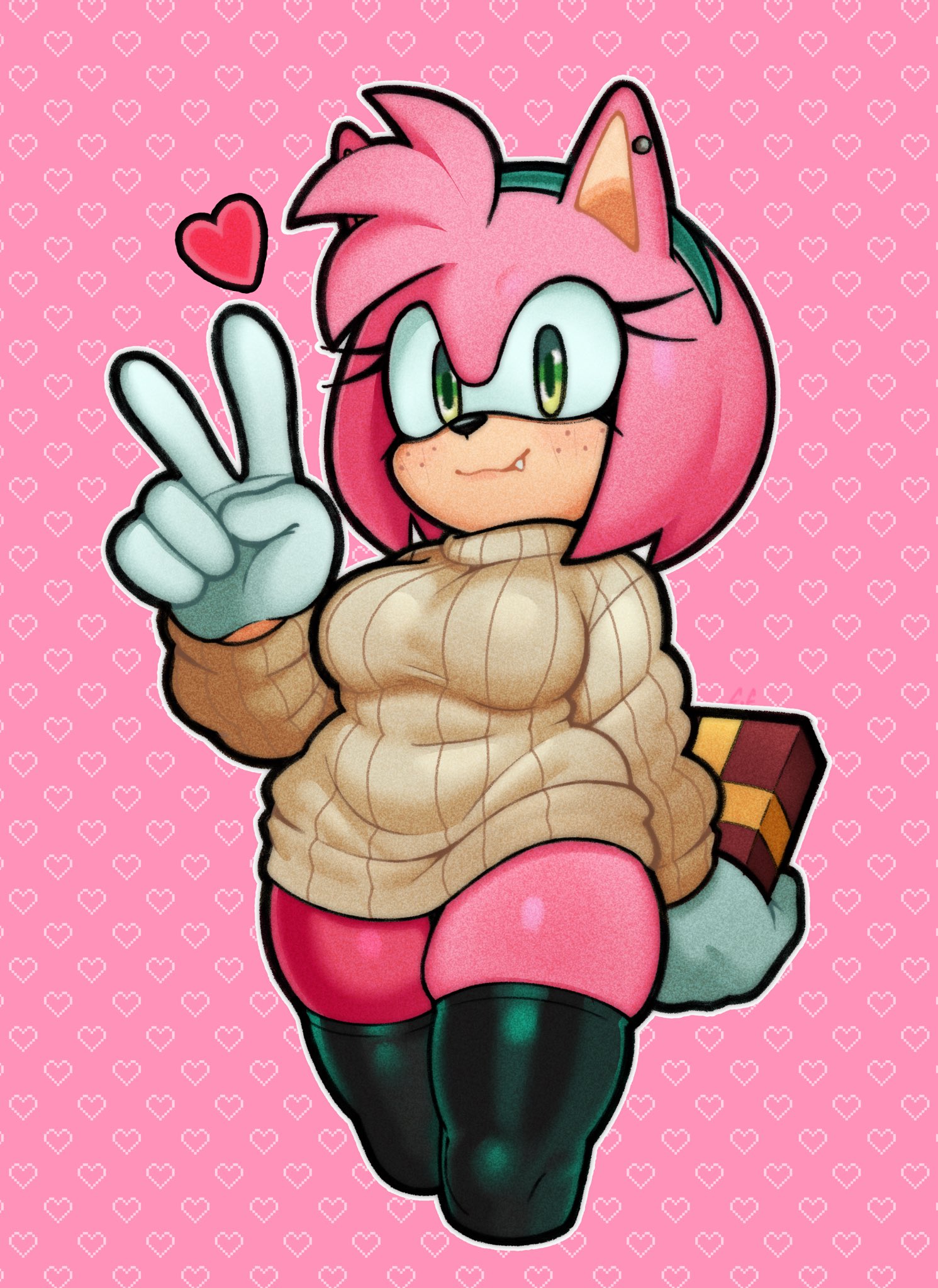 amy rose v sign sweater stockings freckled face freckles hairband champchidi sonic the hedgehog