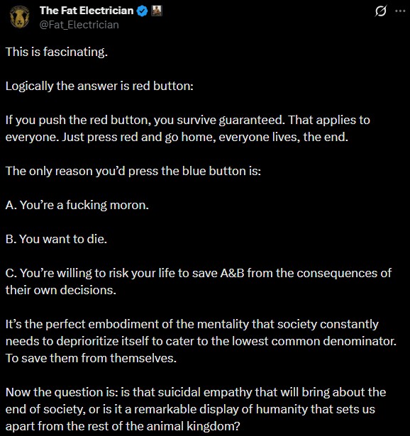 tim urban red button or blue button question red vs blue button moral dilemma twitter x tweet red or blue button dilemma red button vs blue button poll