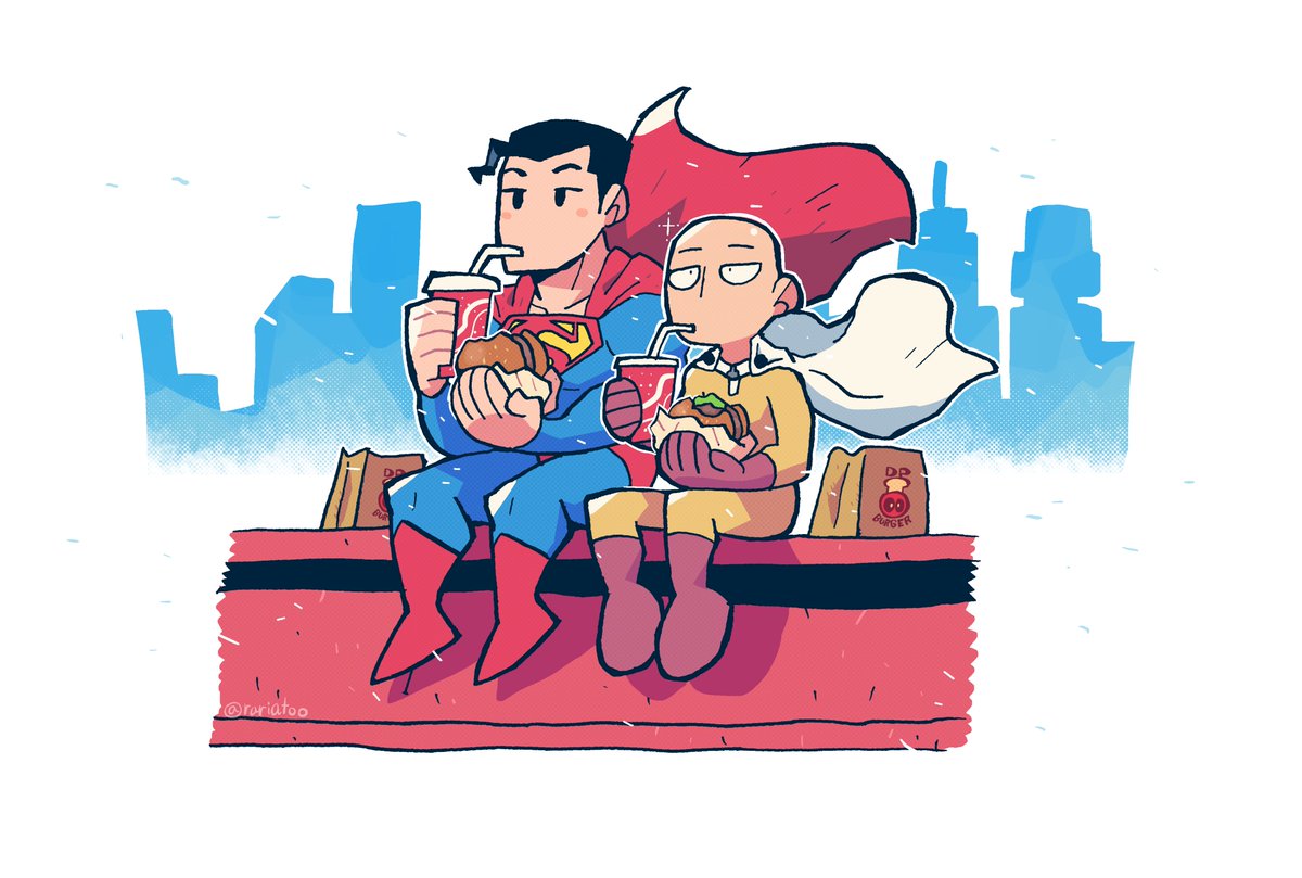 superman dc comics saitama one-punch man deadpool dp burger fast food eating hanging out rariatoo breeze soda shine
