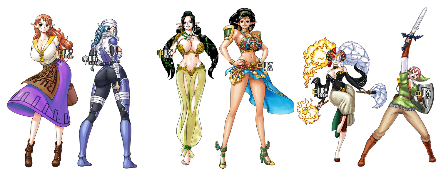 one piece nami nefertari vivi boa hancock nico robin uta rebecca the legend of zelda malon sheik great fairy urbosa twinrova link master sword hylian shield art_iurypadilha